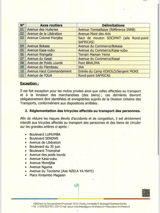 Dans un effort pour réguler les motos-taxis, des axes spécifiques sont désormais interdits à leur circulation. Parmi les principales routes concernées figurent des boulevards clés tels que le Boulevard Lumumba et le Boulevard de la Libération, qui étaient jusque-là des artères principales du transport dans la ville. Ces interdictions visent à limiter l’encombrement dans les zones très fréquentées et à assurer une meilleure fluidité du trafic.